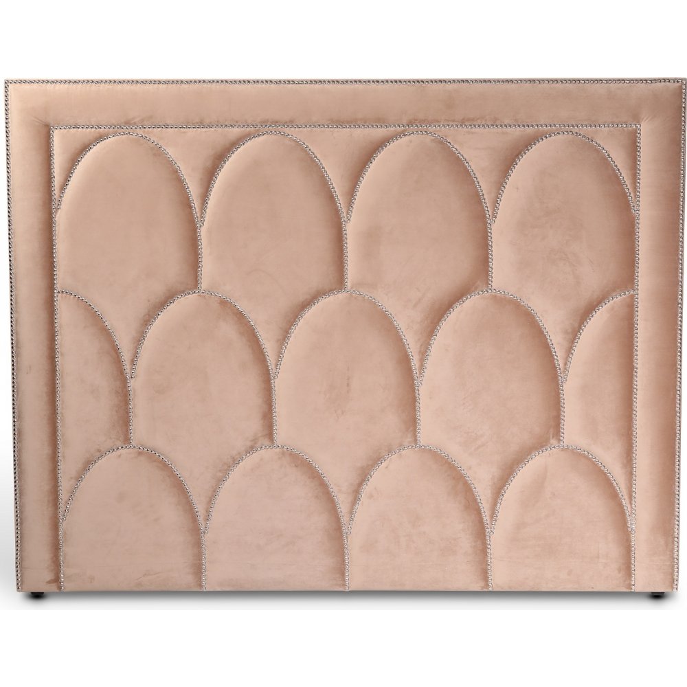 Bianca ist ein Bett Kopfteil aus einem beigen Samtstoff von weicher und schöner Qualität. Das Kopfteil kommt in einer Ausführung, die dem Schlafzimmer mit den Nieten aus verchromtem Metall Luxus und Flair verleiht.