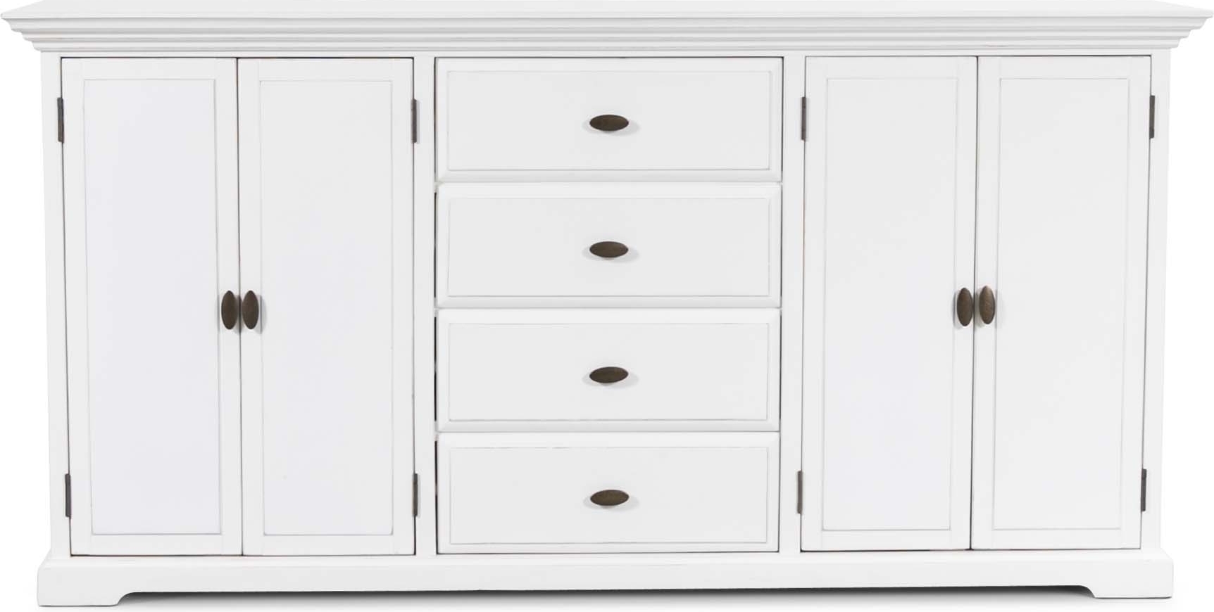 Paris ist eine stilvolle und schöne Serie. Die Anrichte ist aus weiß gemalter Pappel/MDF gefertigt. Das Möbelstück bietet mit zwei Schrankfächern und vier Schubladen viel Stauraum. Der Stil ist Vintage mit kleinen, bewussten und handgemachten Abnutzungen im Lack, um den antiken Look zu kreieren.
