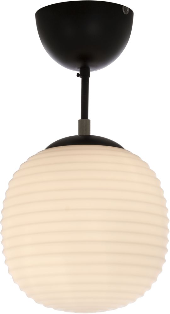 Deckenleuchte aus schwarzem Metall und opalweißem Glas. Einfach an der Decke aufgehängt.