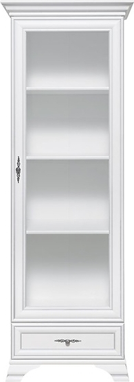 Ein schöner Vitrinenschrank in weiß mit mehreren, praktischen Regalböden und einer Schublade am unteren Ende für kleinere Gegenstände. Die dekorativen Handgriffe aus Metall und die schönen Details an den Fronten und Beinen machen das Möbelstück zu einer klassischen Komponente in Ihrer Einrichtung.