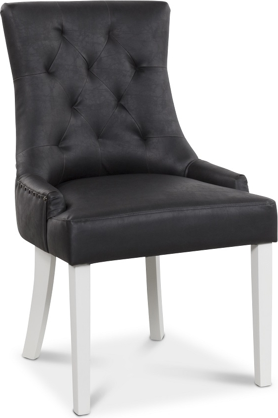 Tuva Stuhl in schwarzem Vintage-PU mit antikfarbenen Nieten als stilvolles Detail. Solide weiße Beine. Der Stuhl ist gut verarbeitet und einer unserer beliebtesten Esszimmerstühle.