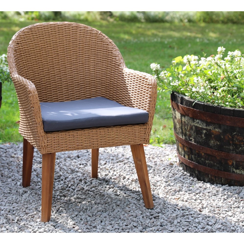 Esszimmerstuhl Valetta aus künstlichem Rattan mit braunen Beinen von Skånska Möbelhuset. Der Outdoor-Stuhl hat ein hellbraunes Kunstrattan mit passendem grauem Sitzkissen. Perfekt für den Tisch auf der Terrasse oder im Wintergarten.
